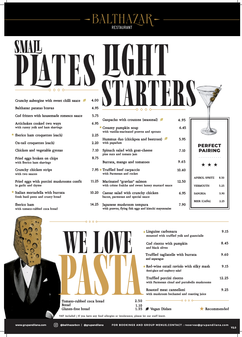 Elegant, formal, and with an avant-garde feel, Balthazar has two private rooms for 30 and 35 people, and a lovely terrace in a quiet passage in Eixample, very close to Av. Diagonal and La Pedrera.