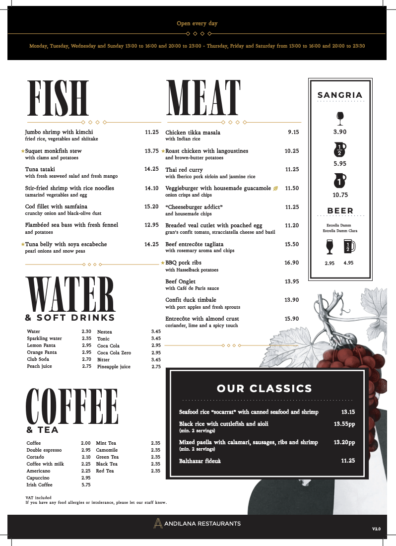 Menú de migdia a 11,90€ i mig menú a 8,5€ , de dilluns a divendres al migdia. Vespre i caps de setmana hi ha carta.