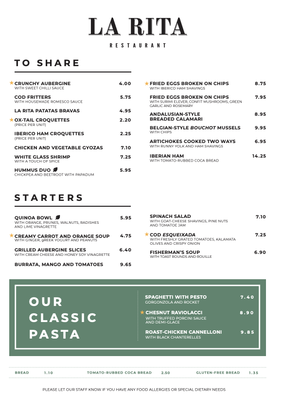 Very close to Paseo de Gracia and Casa Batlló, La Rita is a small and cozy restaurant with a room with a capacity of 50-60pax, and a great reference of Mediterranean, traditional and market cuisine.